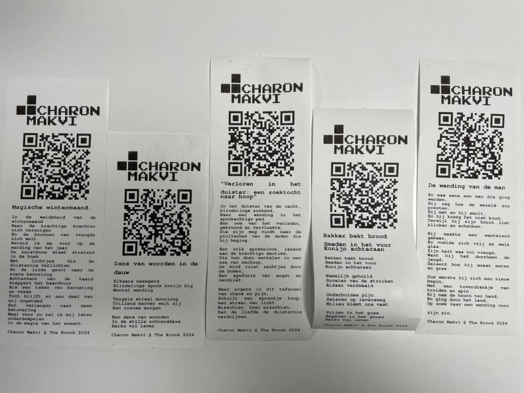 Van jong tot oud, iedereen is welkom om deel te nemen aan dit magische avontuur. Kom langs, druk op de knop en laat je verbeelding de vrije loop terwijl je met Charon danst, beweegt of grappige gezichten trekt. In ruil daarvoor word je beloond met unieke AI-gedichten, die gegarandeerd een glimlach op je gezicht toveren.